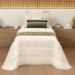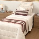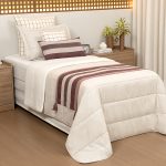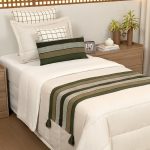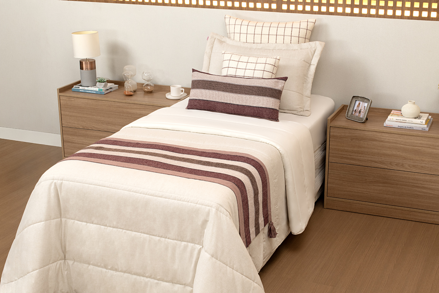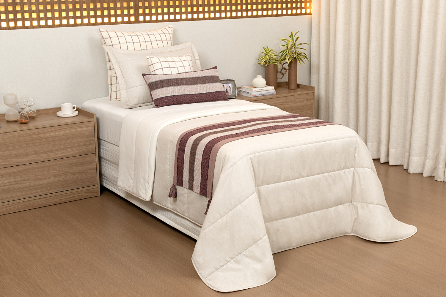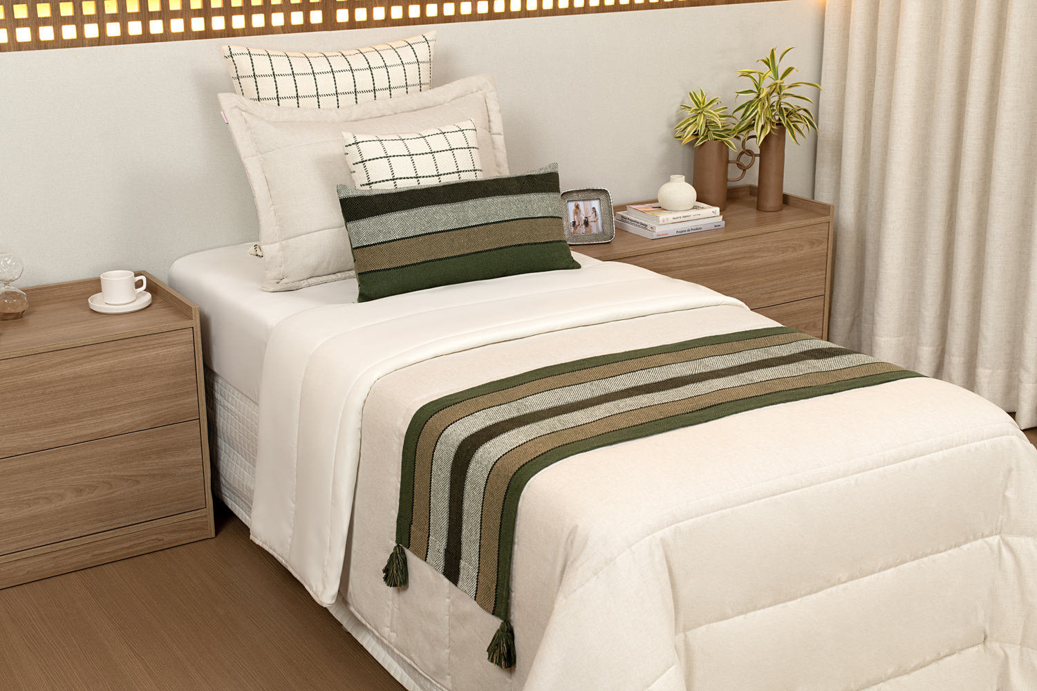 O kit é composto por 5 peças, com cobre-leito confeccionado em tecido com efeito linho e toque de 300 fios, além de acessórios em tear 100% algodão, que completam a composição com ainda mais elegância.