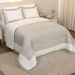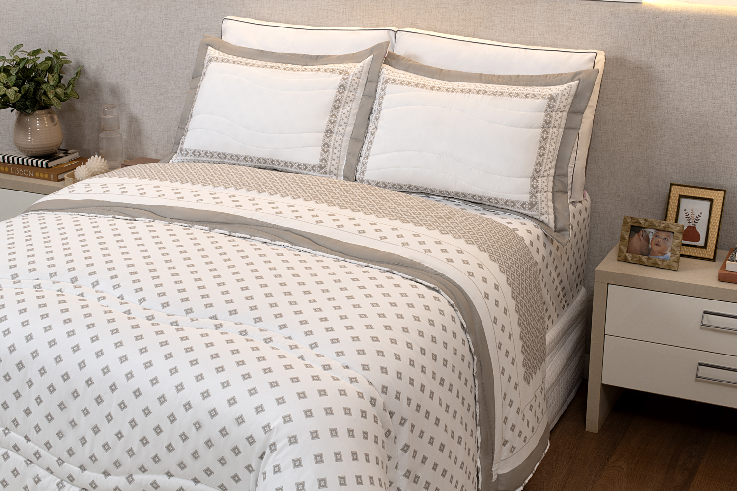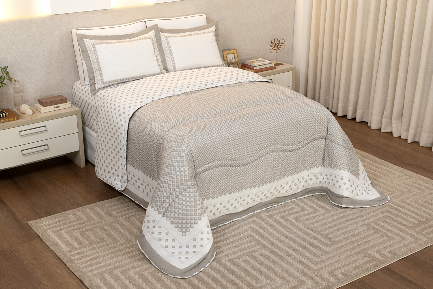 Linhas que se encontram em formas que organizam o olhar. Geometria sofisticada que transforma o quarto em cenário e um toque super macio que convida ao descanso.